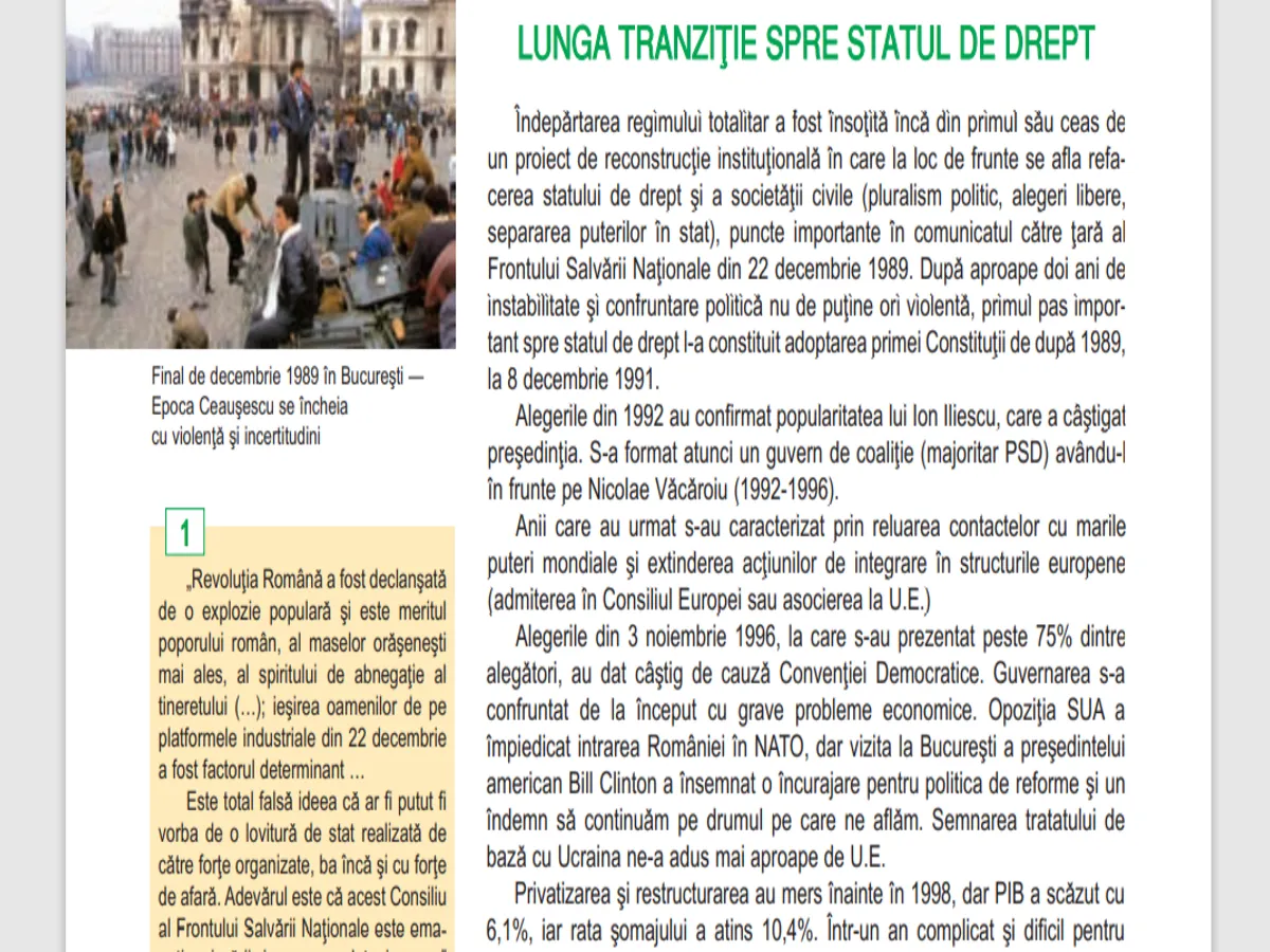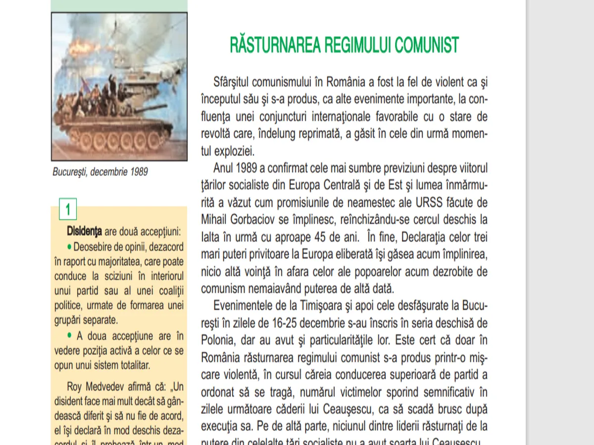 „1989 a fost momentul revenirii României între statele democratice ale lumii. O revenire spectaculoasă, datorată revoluției televizate în direct, și tragic, prin sacrificiile umane din decembrie 1989”, mai scrie în manual.