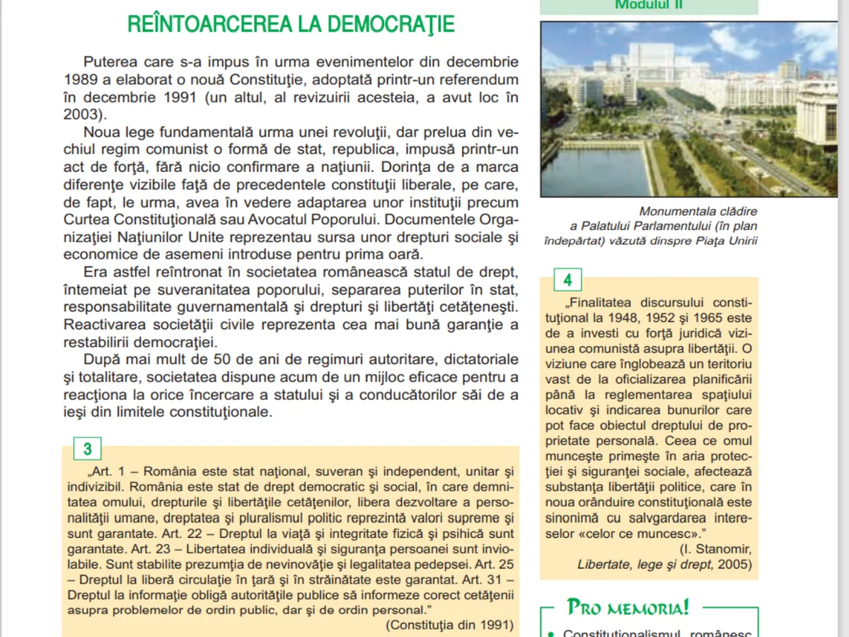 „Puterea care s-a impus în urma evenimentelor din decembrie 1989 a elaborat o nouă Constituție, adoptată printr-un referendum în decembrie 1991 (un altul, al revizuirii acesteia, a avut loc în 2003). Noua lege fundamentală urma unei revoluții, dar prelua din vechiul regim comunist o formă de stat, republica, impusă printr-un act de forță, fără nicio confirmare a națiunii.