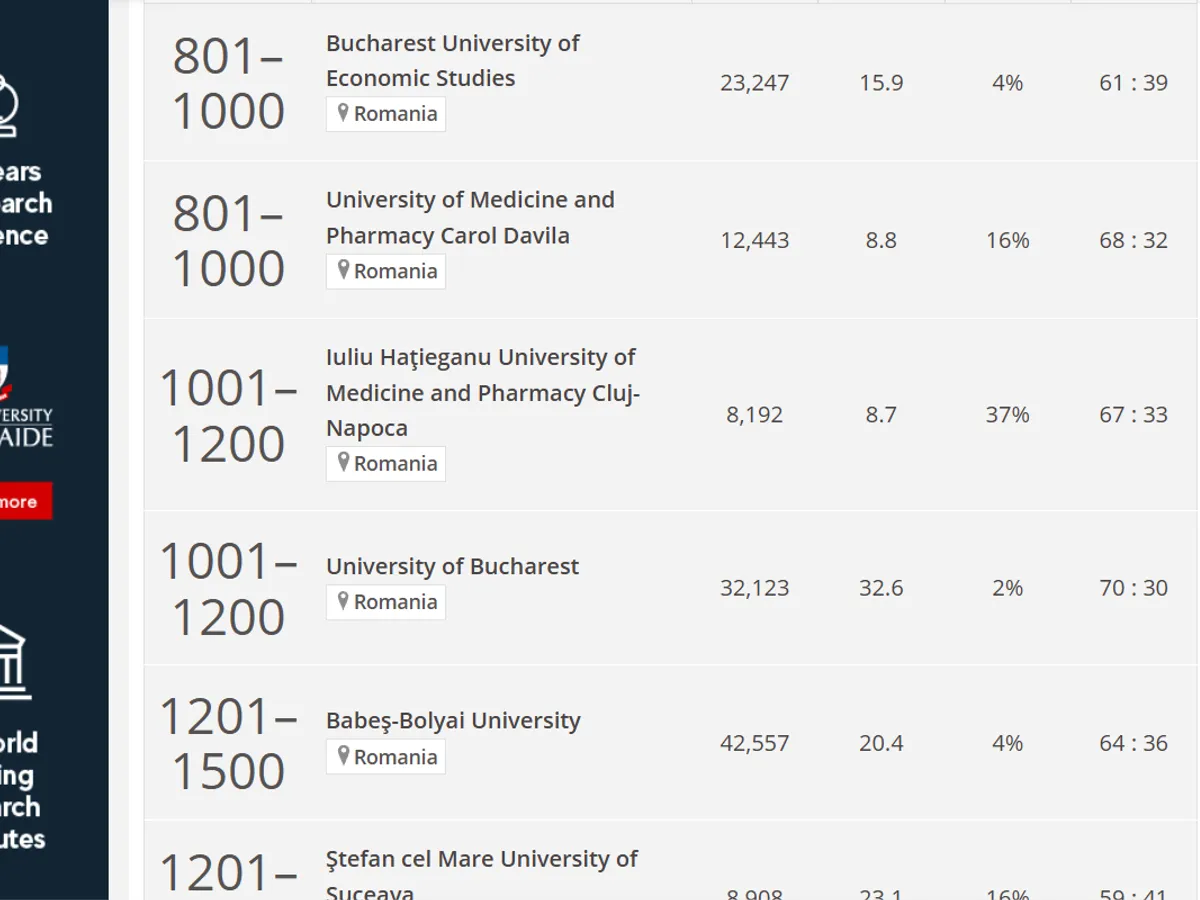 Nicio universitate din România nu este în top 800 al Universităților la nivel internațional. ASE ocupă pozițiile 800 -1000 ca și Univeristatea de Medicină Davila.
