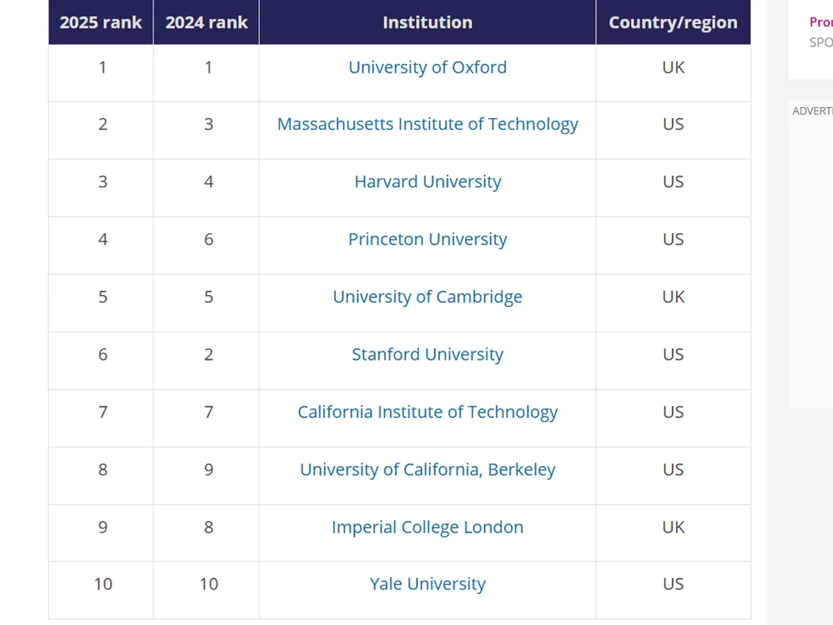 Universitatea Harvard a trecut de pe locul patru pe locul trei, iar Universitatea Princeton de pe locul șase pe locul patru.