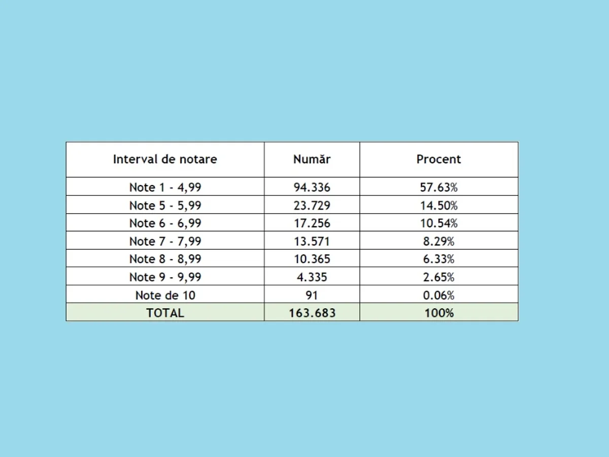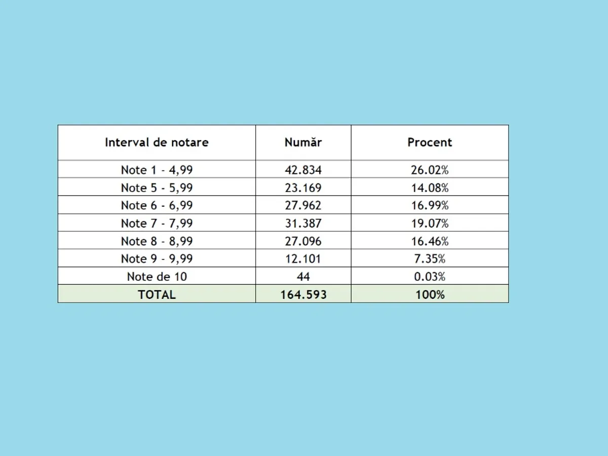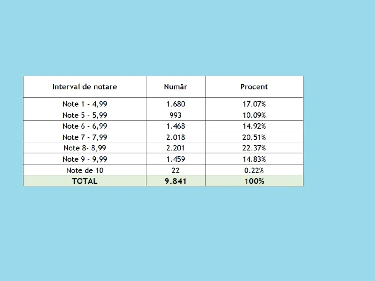 Potrivit rapoartelor statistice furnizate de platforma informatică, se înregistrează următoarea situație pe probe și tranșe de note:
