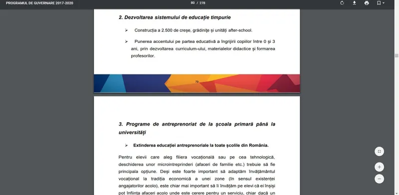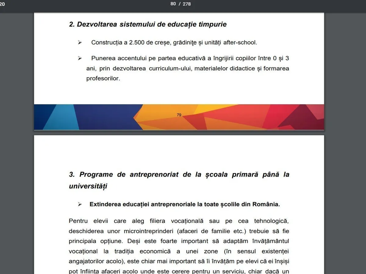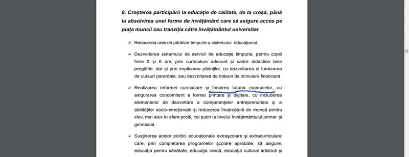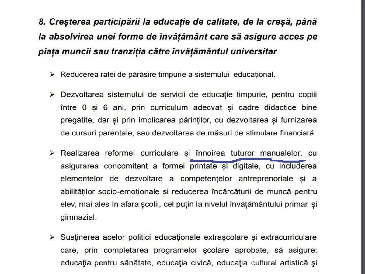 Tot în „Programul de guvernare” se precizează: „Realizarea reformei curriculare și înnoirea tuturor manualelor, cu asigurarea concomitent a formei printate și digitale, cu includerea elementelor de dezvoltare a competențelor antreprenoriale și a abilităților socio-emoționale și reducerea încărcăturii de muncă pentru elev, mai ales în afara școlii, cel puțin la nivelul învățământului primar și gimnazial”.
