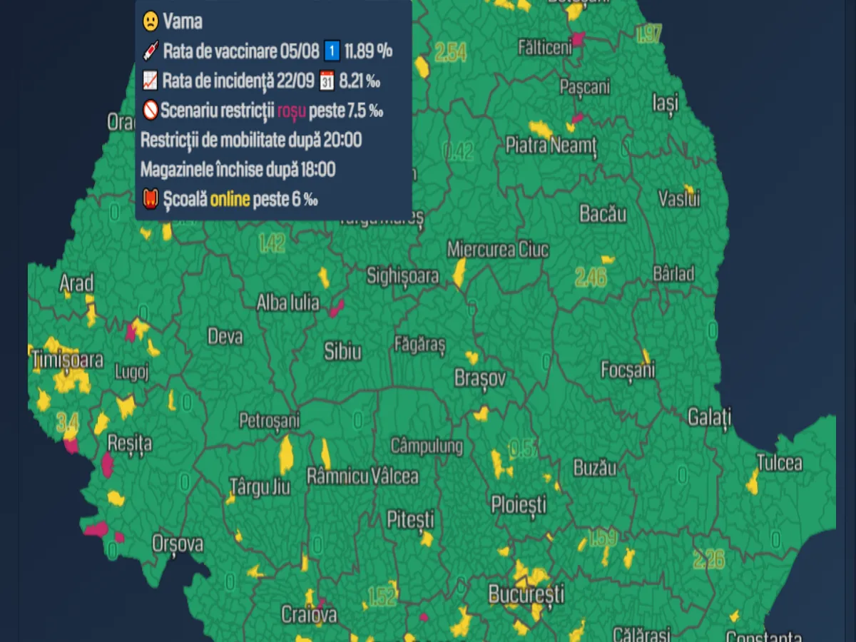 Potrivit monitorizării pe care o găsiți AICI, un număr de 40 de localități au depășit 6 infectări la mie. Este posibil ca unele școli din aceste localități să nu fi trecut în online.