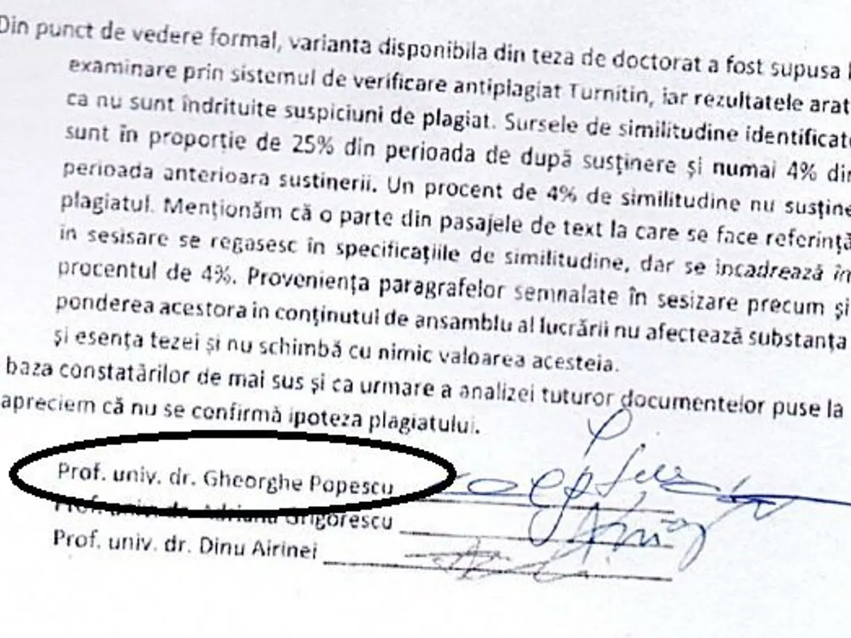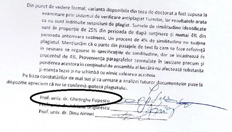 n Cei trei membri (ceilalți doi au fost Adriana Grigorescu de la Școala Națională de Studii Politice și Administrative și Dinu Airinei de la Universitatea ”Alexandru Ioan Cuza” din Iași) au dat la o parte cele mai multe dintre dovezi și au decis că există doar 4% plagiat din totalul lucrării, ceea ce ”nu afectează substanța și esența tezei și nu schimbă cu nimic valoarea acesteia. (...) apreciem că nu se confirmă ipoteza plagiatului.”