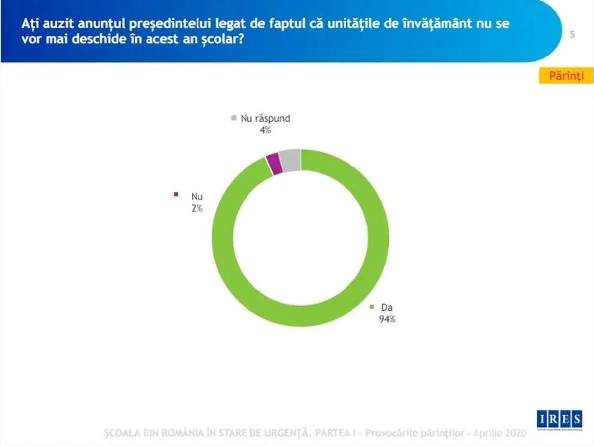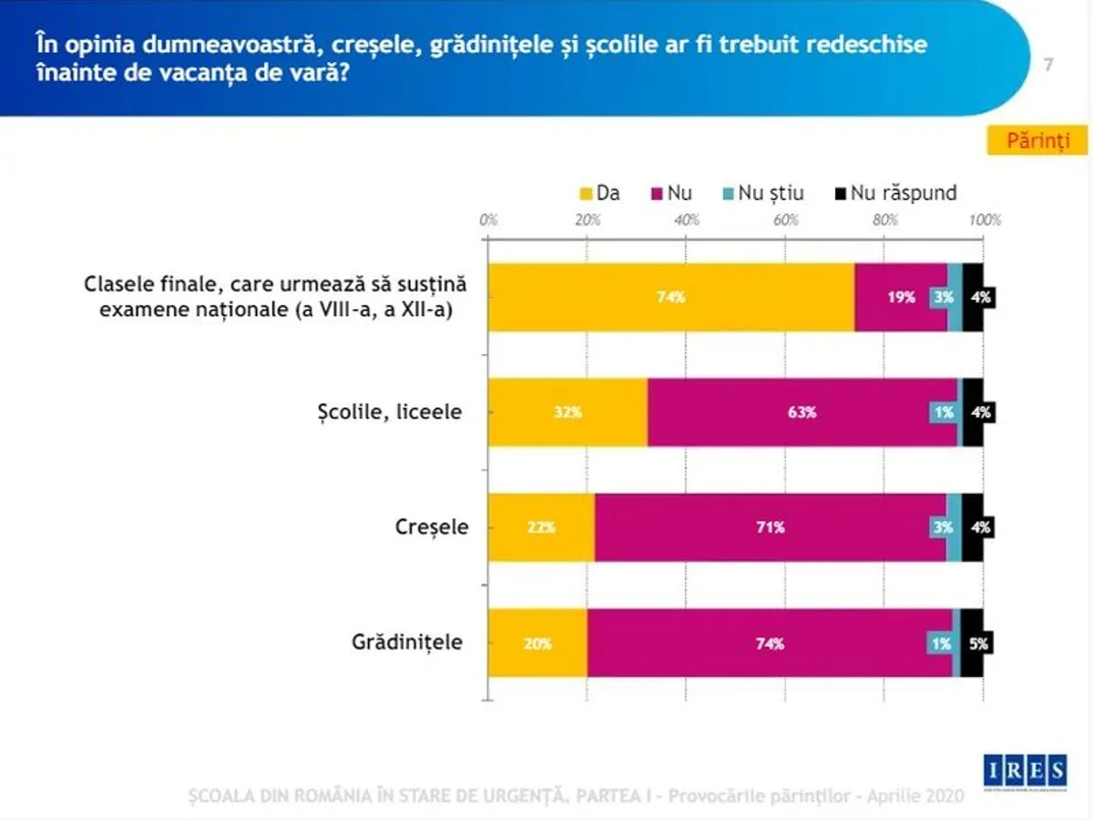 Aproximativ trei sferturi dintre părinții din România agreează decizia autorităților de a nu redeschide unitățile de învățământ în acest an școlar.
