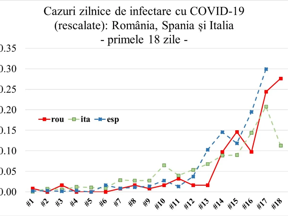 Pattern-ul cazurilor confirmate zilnic de infectări cu COVID-19, în primele 18 zile, este similar cu cel din alte țări europene (e.g., Spania sau Italia). Nu însă și magnitudinea.