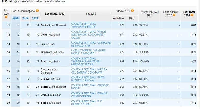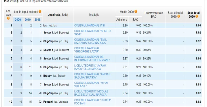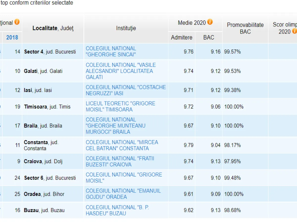 Cel mai bun liceu este Colegiul Național Iași, urmat de Colegiul Sava din București și Colegiul „Emil Racoviță” din Cluj Napoca.