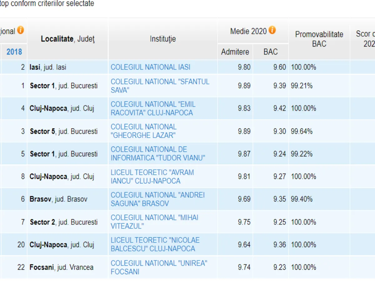 Top 20 cele mai bune licee din România. Nota 9,60 la Evaluarea națională nu îți asigură admiterea