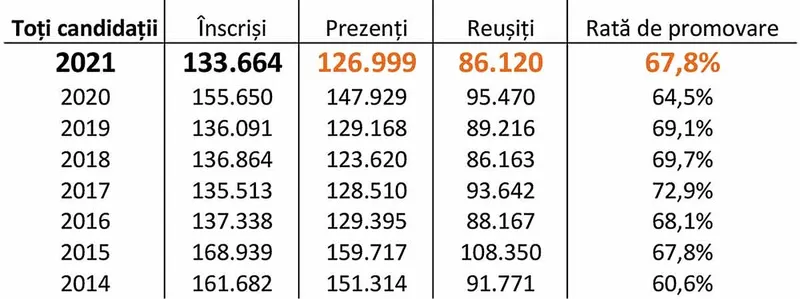 În anul 2021, după contestații, numărul elevilor care au luat bacalaureatul a fost 88.000 de elevi. Față de acum un deceniu, procentul celor care nu au luat bacalaureatul a fost mai mic cu 20%.