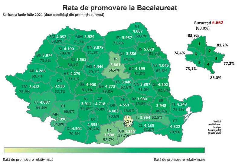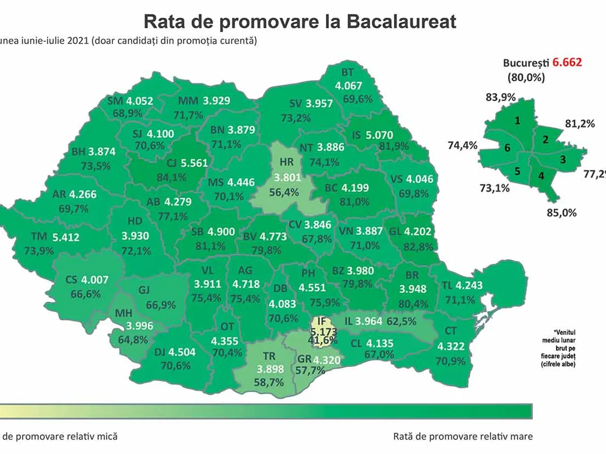 București, cu cel mai mare venit lunar mediu brut (6.666 lei), are și un număr mare de absolvenți (80%). Statistica include doar elevii prezenți la bacalaureat din generația curentă.
