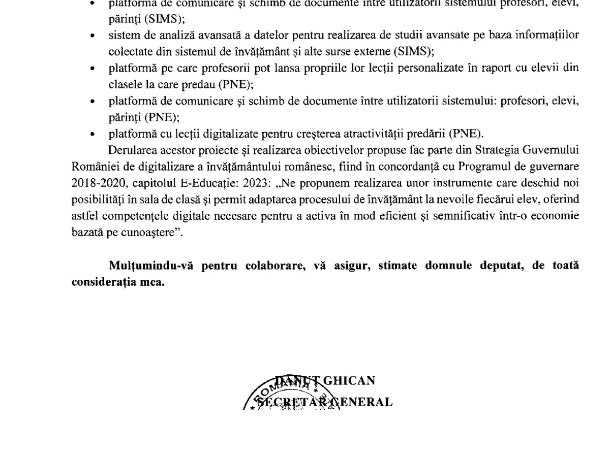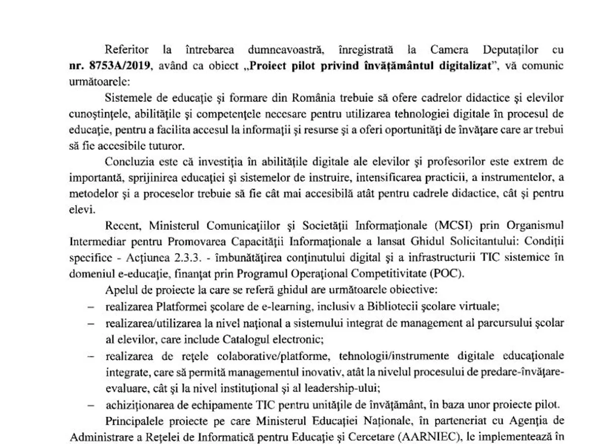 În octombrie 2019, Ministerul Educației răspunde interpelării deputatului Sebastian Moise în legătură cu situația implementării „Proiect pilot privind învățământul digitalizat”.