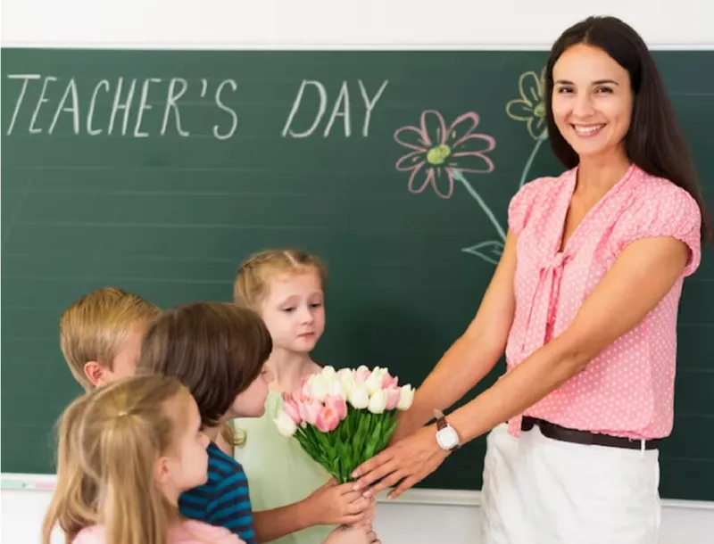 Profesoara primește flori de la copii Foto: Freepik.com