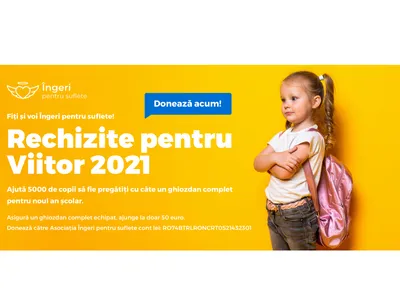 Educație Asigură educația unui copil cu un ghiozdan pregătit de școală. Donează, educă și schimbă viitorul Asociația non-guvernamentală Îngeri pentru suflete lansează campania de strângere de fonduri „Rechizite pentru viitor”.