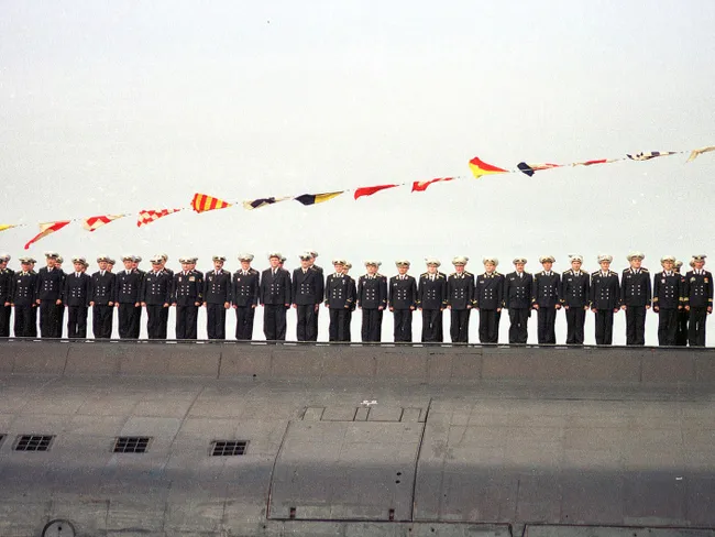 Comandantul britanic al Seaway Eagle, Paul Russel (centru) cere la comandantul Flotei Nordice a Rusiei, amiralul Popov, permisiunea de a acorda ajutor echipajului Kursk - Foto: Profimedia Images (imagine cu rol ilustrativ)