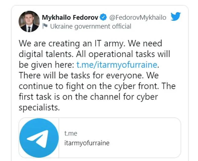 „Creăm o armată IT. Avem nevoie de talente digitale. Toate sarcinile operaționale vor fi date aici: https://t.me/itarmyofurraine. Vor fi sarcini pentru toată lumea. Continuăm să luptăm pe frontul cibernetic. Prima sarcină este pe canalul specialiștilor cibernetici”, a scris Federov pe Twitter.