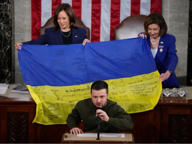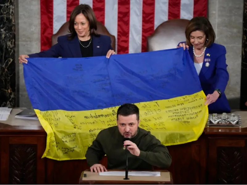 Învăluită în secret până în ultimul minut, vizita istorică a fost încărcată de simbolism, de la hanoracul verde mohorât al lui Zelenski, la cravata cu dungi albastre și galbene a președintelui Joe Biden, până la steagul de luptă ucrainean desfășurat pe podeaua Camerei.