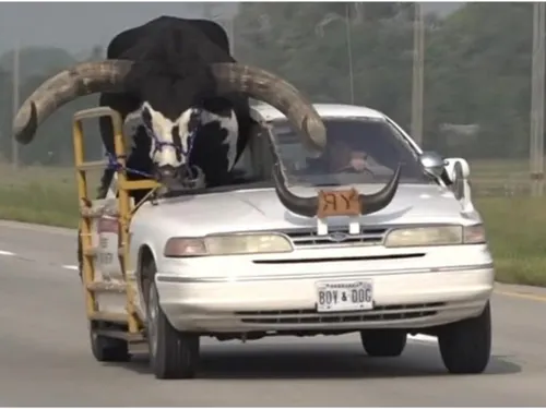 Incident neobișnuit pe o autostradă din Nebraska. Polițiștii au oprit în trafic o mașină care avea un taur uriaș pe scaunul pasagerului. Pentru ca animalul să aibă loc, proprietarul mașinii a fost nevoit să taie jumătate din acoperișul mașinii.