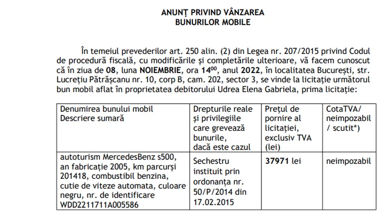 Fiscul a scos la licitație un autoturism Mercedes Benz S500,an fabricație 2005, km parcurși 201418, benzina, cutie de viteze automata, culoare