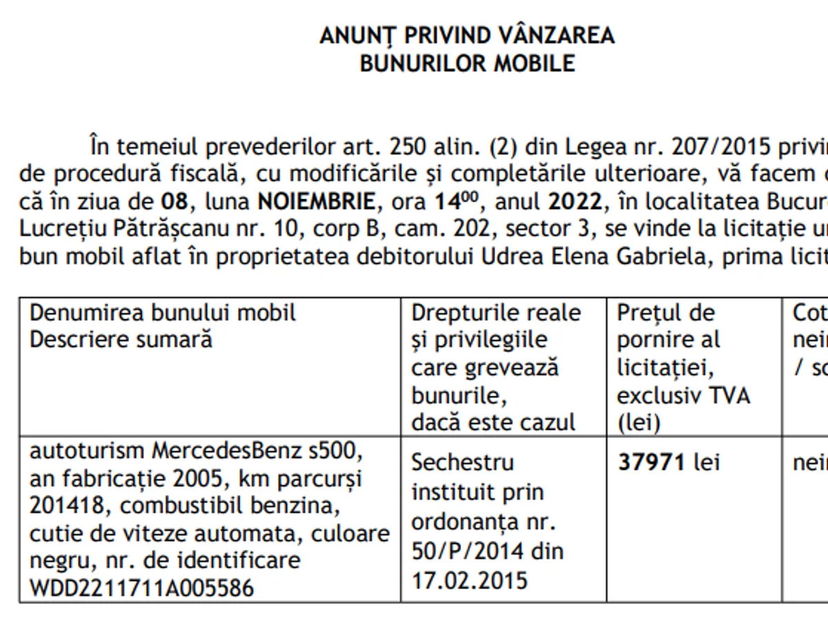 ANAF vinde Mercedesul S500 al Elenei Udrea cu 7.700 de euro, un Fiat și terenuri de 800.000 de euro