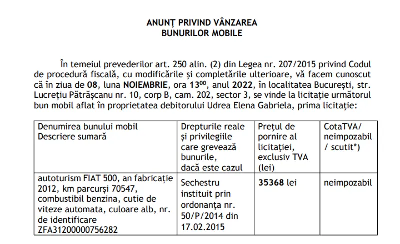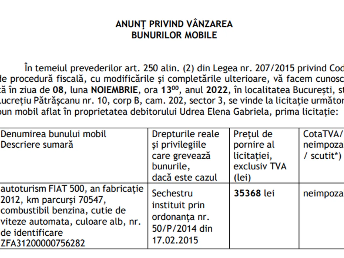 De asemenea, statul încearcă se recupereze și contravaloarea unui autoturism FIAT 500, an fabricație 2012, km parcurși 70547,