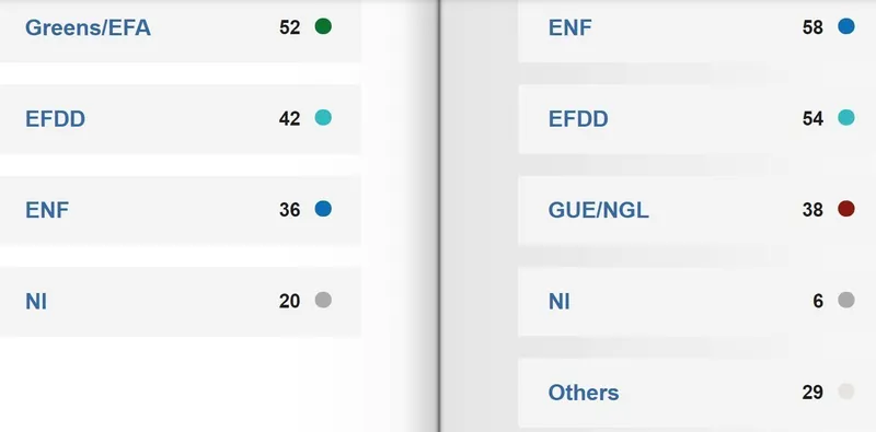 Grupul Europa Naţiunilor şi a Libertăţii (ENF), în care se află în prezent deputaţii Adunării naţionale şi ai Ligii, ar creşte de la 36 de membri la 58 în următorul PE, potrivit ultimelor proiecţii. Grupul populist Europa Libertăţii şi a Democraţiei Directe (EFDD) ar câştiga şi el aproape o duzină de locuri, până la 56.