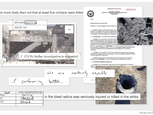 Bazată pe 1.300 rapoarte ale Pentagonului referitoare la incidente care au avut victime civili, informaţii obţinute de cotidianul american conform legii privind transparenţa în administraţii (FOIA), această anchetă publicată de The New York Times subminează imaginea unui război „curat” purtat cu „lovituri de precizie” prezentate regulat de armata americană.
