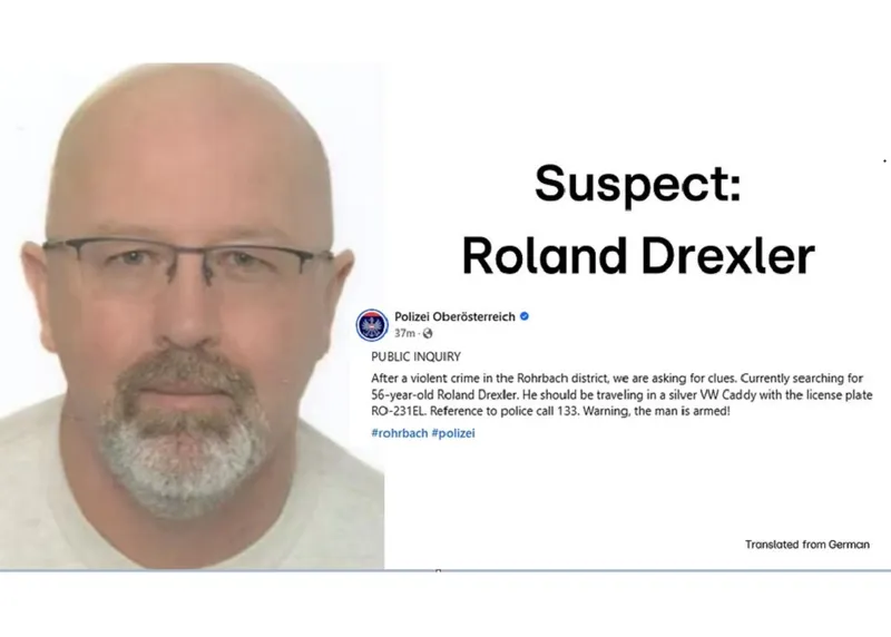 Poliția din Oberösterreich a publicat un comunicat de presă în care îl identifică pe trăgător drept Roland Drexler, în vârstă de 56 de ani, despre care se crede că conduce un VW Caddy argintiu cu plăcuța de înmatriculare RO-231EL.