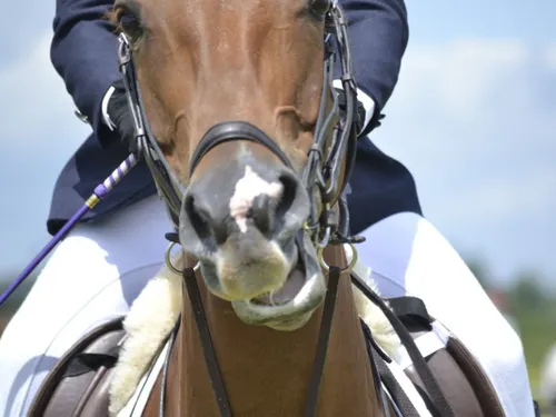 Calul s-a speriat și a sărit la jumătatea barierei înalte din față a boxei și a rămas atârnat cu picioarele din față, pe o parte a barierei, și picioarele din spate prinse în interiorul boxei.