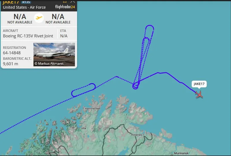 În același timp, o aeronavă de recunoaștere Boeing RC-135V Rivet Joint a survolat bazele Flotei Nordului din regiunea Murmansk.