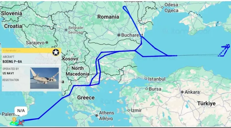 Un Boeing P-8A Poseidon al Marinei SUA a efectuat o misiune extinsă de informații prin semnale (SIGINT) deasupra Mării Negre, după decolarea de pe NAS Sigonella (Sicilia).
