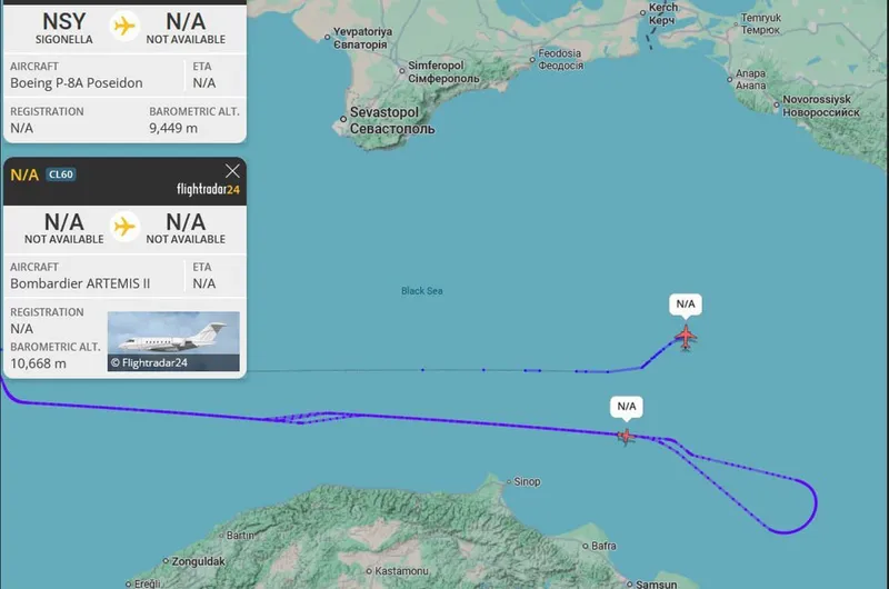 Avioane de recunoaștere americane Boeing P-8A Poseidon și Bombardier ARTEMIS II au efectuat zboruri de recunoaștere în Marea Neagră, în direcția bazelor navale rusești din Crimeea și Novorossiisk.