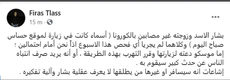 Firas Tlass, fiul fostului ministru al Apărării în regimul Assad, refugiat de la începutul revoluției în Siria, din 2011, a scris pe pagina sa de Facebook că, potrivit unor surse din interior, Bashar și soția sa nu sunt infectați cu coronavirus.