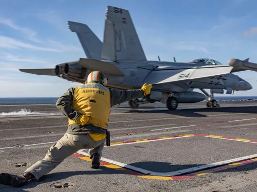 Footage released by USCENTCOM showing US Navy F/A-18E/F Super Hornets, EA-18G Growlers, and an E-2C Hawkeye launching from the USS Eisenhower to conduct strikes on Houthi targets in Yemen this evening. pic.twitter.com/mADzo2sGc8