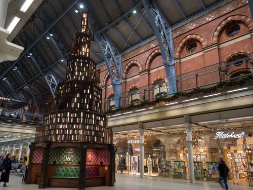 Cea mai veche librărie din Marea Britanie a venit cu ingenioasa idee de a împodobi, în gara St Pancras, un copac de 12 metri înălțime, cu o scară în serpentină, pe care sunt așezate aproximativ 270 de rafturi de cărți.