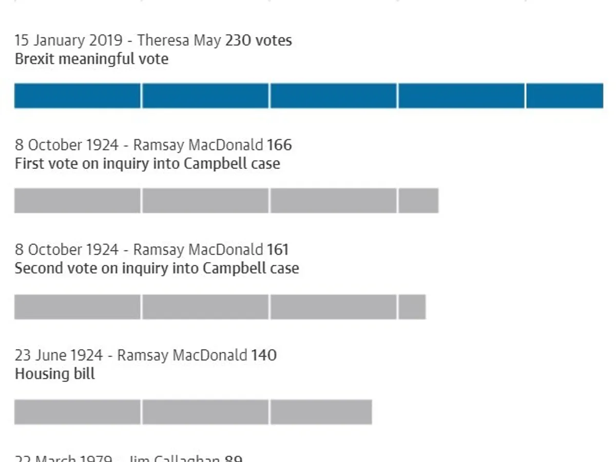”Înfrângerea din această seară este cea mai mare înfrângere a guvernului în era democratică. Acest grafic prezintă câteva dintre ele, pentru comparație”, a scris ”The Guardian”.