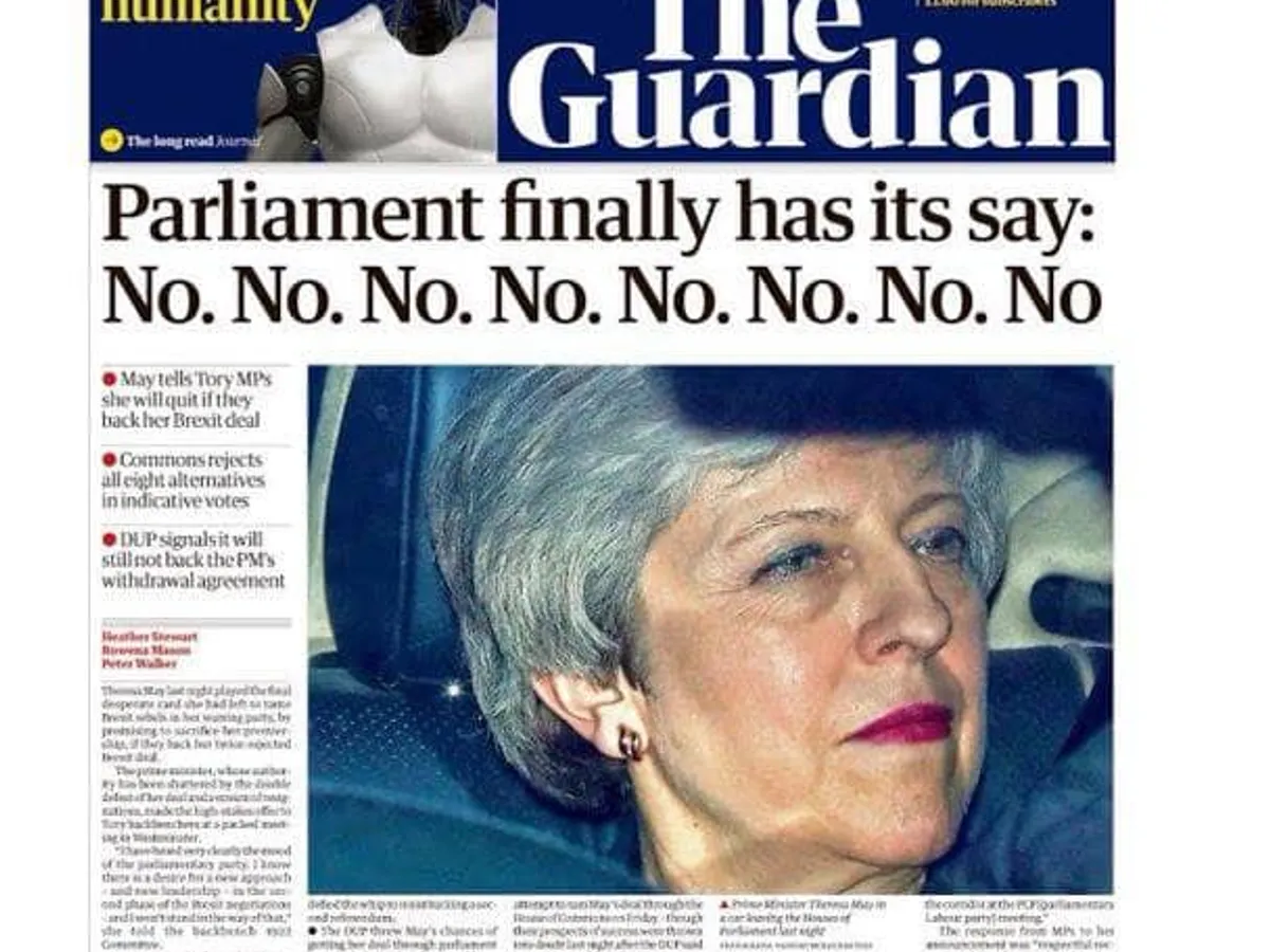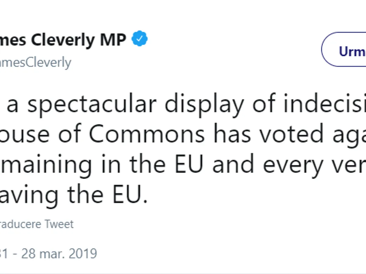 ”Într-un spectaculos spectacol de indecizie, Camera Comunelor a votat împotriva rămânerii în UE și împotriva fiecărei versiuni a ieșirii din UE”.