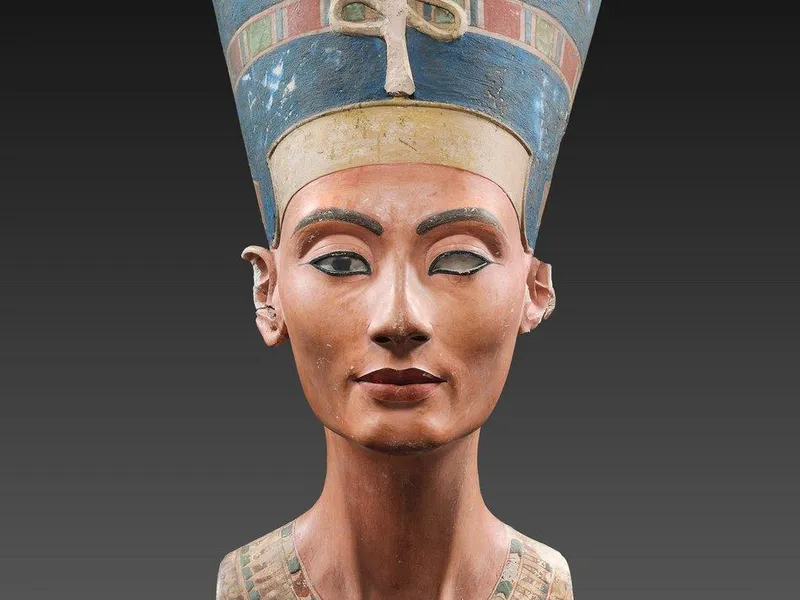 Celebrul bust pictat al reginei Nefertiti, realizat în calcar, a fost descoperit la Tell el-Amarna, la aproximativ 300 km sud de Cairo, în 1912 de o misiune arheologică germană, care l-a trimis la Berlin anul următor.