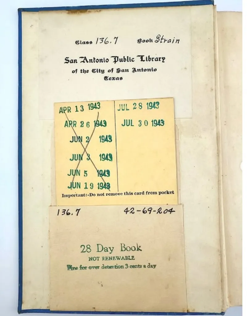 Conținutul a uimit echipa: o carte non-ficțiune de Frances Bruce Strain, terapeut de familie, fusese împrumutată pe 30 iulie 1943. Ar fi trebuit returnată 28 de zile mai târziu, dar în schimb, a petrecut aproape 82 de ani în cutiile familiei, în poduri și în timpul mutărilor. Acum a reapărut într-o stare uimitor de bună.