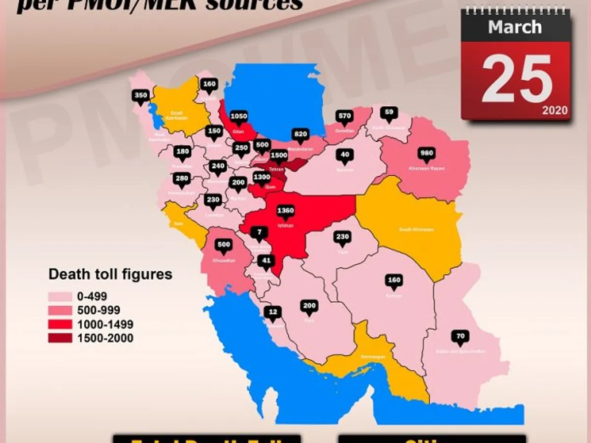 Potrivit MEK, numărul de morți este după cum urmează: Tehran 1.700, Isfahan 1.360, Qom (epicentrul epidemiei) 1.300, Gilan 1.050, Khorasan Razavi 980, Mazandaran 820, Khuzestan 500, Kermanshah 280, Yazd 230, Lorestan 230, Hamadan 240, Zanjan 150.