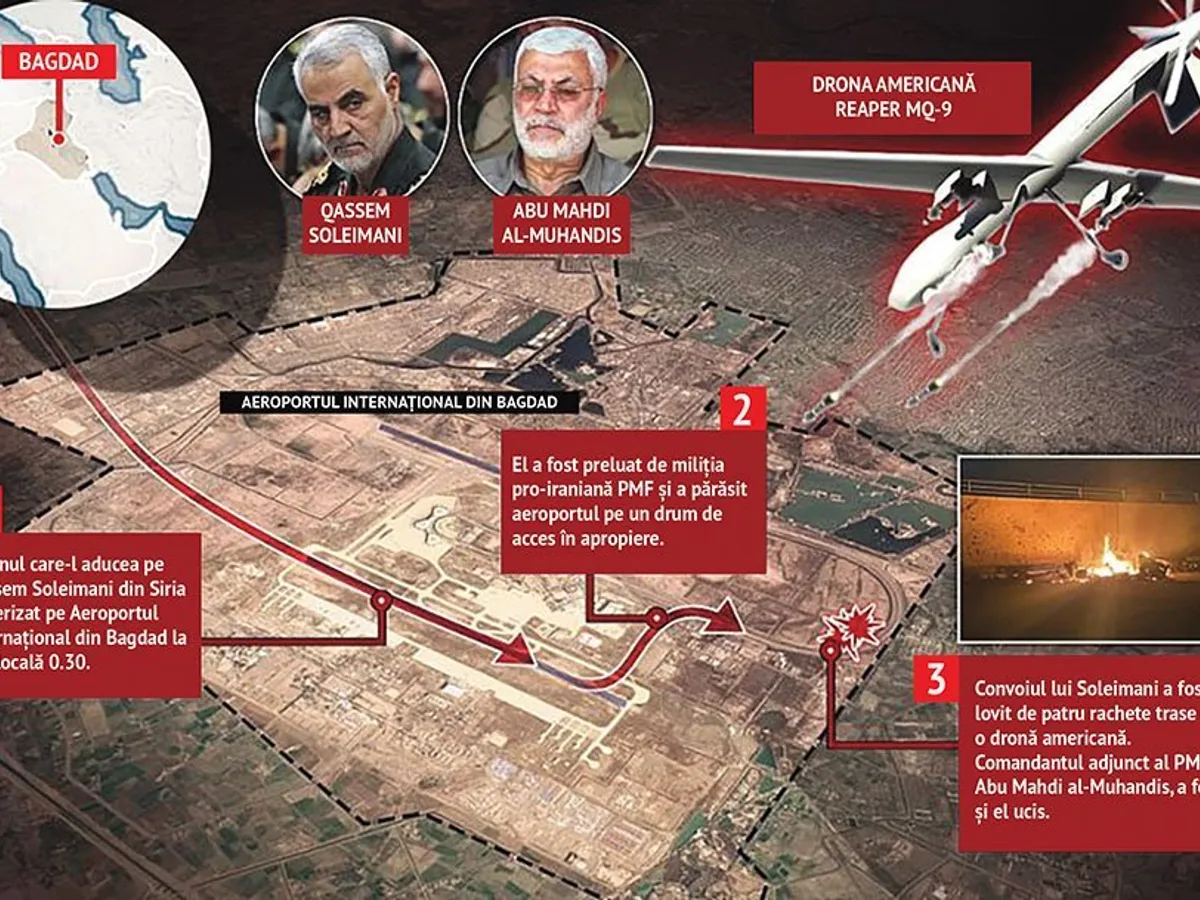 Soleimani, și Abu Mahdi al-Muhandis au fost uciși, după ce convoiul cu care părăseau Aeroportul din Bagdad a fost atacat cu rachete de către o dronă americană.