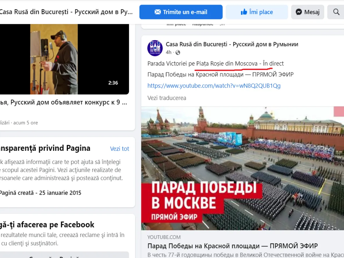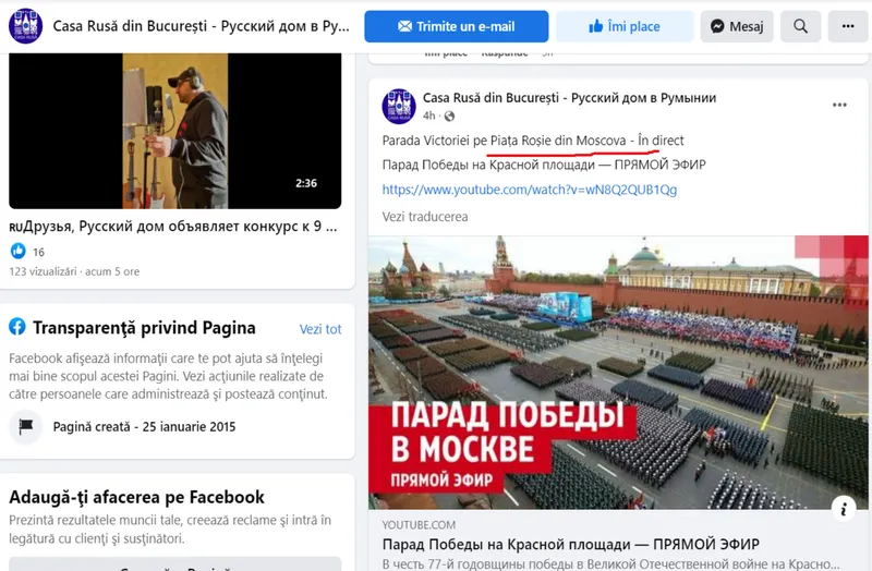 Centrul Cultural rus din București a transmis live parada militară și minciunile lui Putin de 9 mai