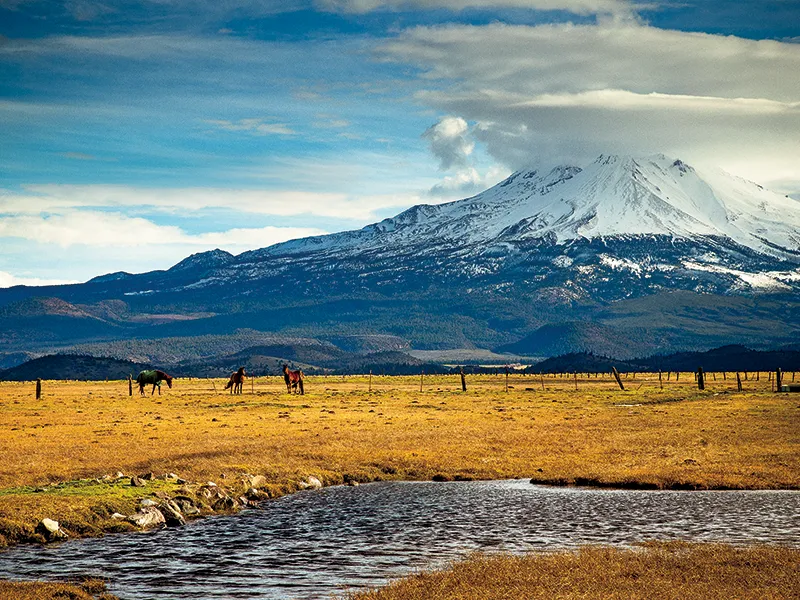 PERFORMANŢĂ DE VÂRF Parcul Vulcanic Naţional Lassen din California de Nord, deasupra, şi, în plan opus, cei şapte vulcani activi.