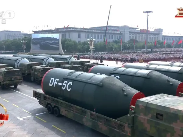 🇨🇳☢️ China showcased its DF-5C intercontinental ballistic missile (ICBM) at the Beijing parade. With a global strike radius, the DF-5C is capable of carrying multiple nuclear warheads and reaching any point on Earth. pic.twitter.com/h2T3K0B453