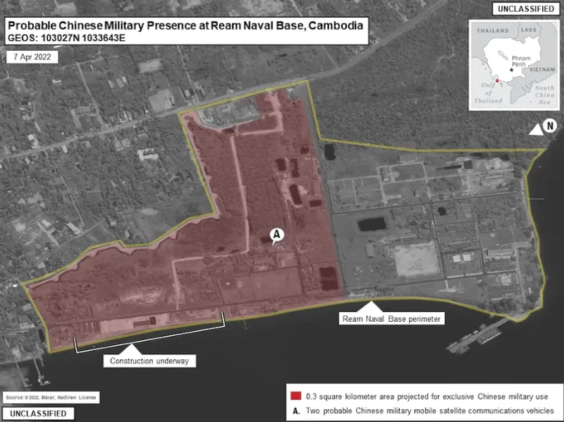 Prezența militară chineză va fi în nordul a bazei navale Ream din Cambodgia din Golful Thailandei, locul unei ceremonii de inaugurare a lucrărilor în această săptămâna aceasta, potrivit oficialilor, care au dat declarații sub rezerva anonimatului. din cauza sensibilităţii problemei.