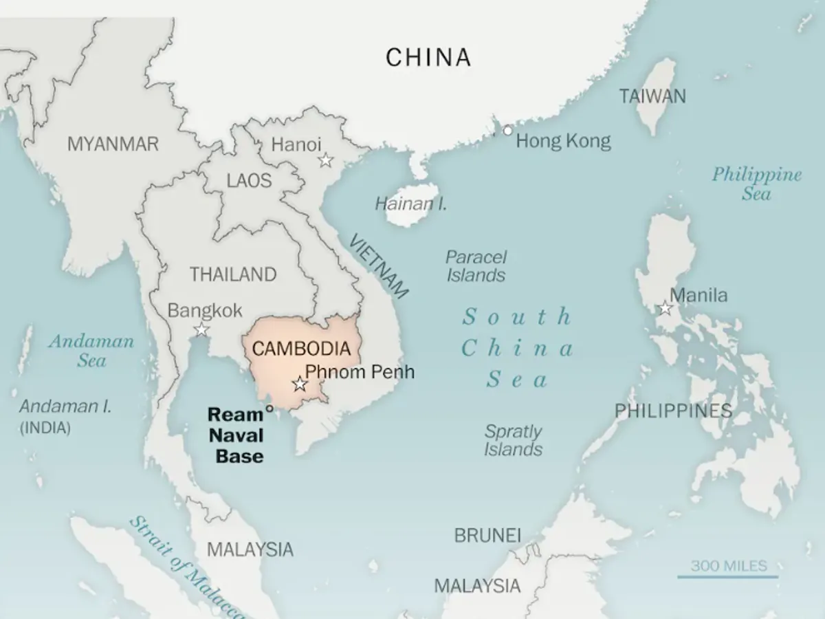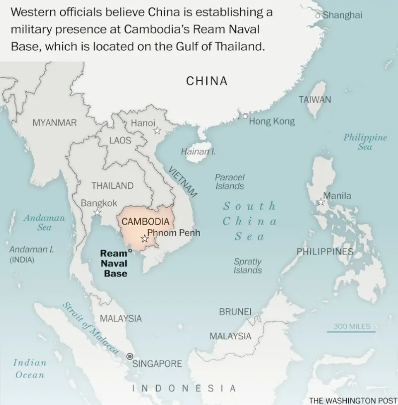 Singura bază militară străină a Chinei în prezent este o instalație navală Djibouti, în estul Africii. O facilitate capabilă să găzduiască nave maritime în vestul Mării Chinei de Sud ar fi un element important al ambiției Chinei de a-și extinde influența în regiune și ar întări prezența în apropierea căilor maritime cheie din Asia de Sud-Est, au spus oficialii.
