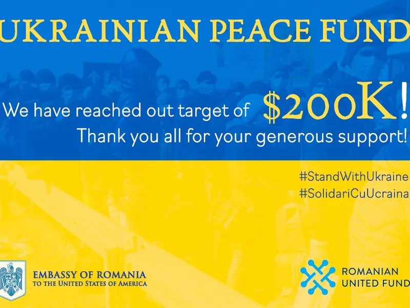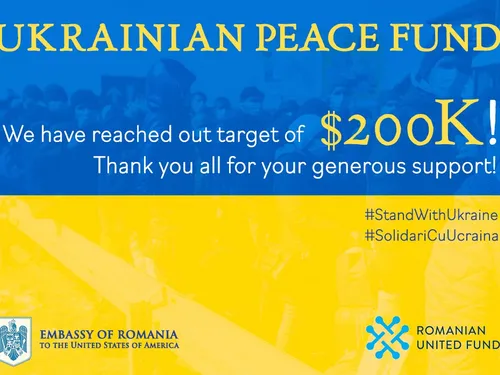 Inițiativa „Ukrainian Peace Fund”, demarată de Ambasada României în Statele Unite împreună cu Romanian United Fund, și-a atins ținta propusă - 200.000 de dolari au fost deja donați, de peste 1300 de donatori.