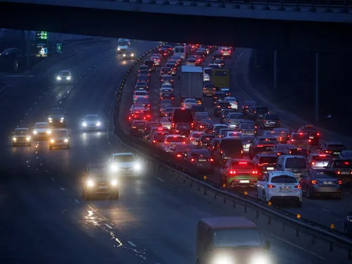 Traficul la ieșirea din Kiev este aproape blocat. Un bulevard important din Kiev, cu patru benzi, este asaltat de mașini care încearcă să părăsească orașul.