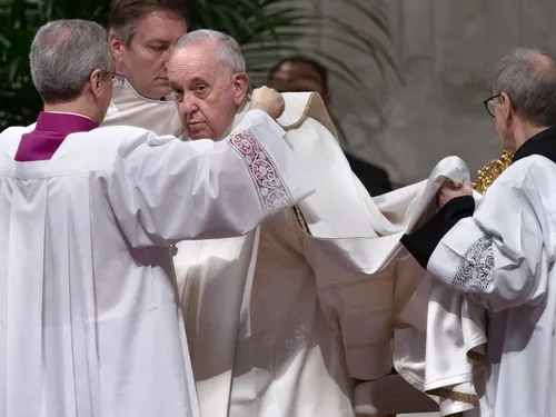 Papa Francisc, care a sosit într-un scaun cu rotile și a stat în picioare cu ajutorul unui baston, nu l-a menționat pe Benedict pe nume în omilia sa până la ultima replică, ceea ce i-a nemulțumit pe cardinalii opozanți.