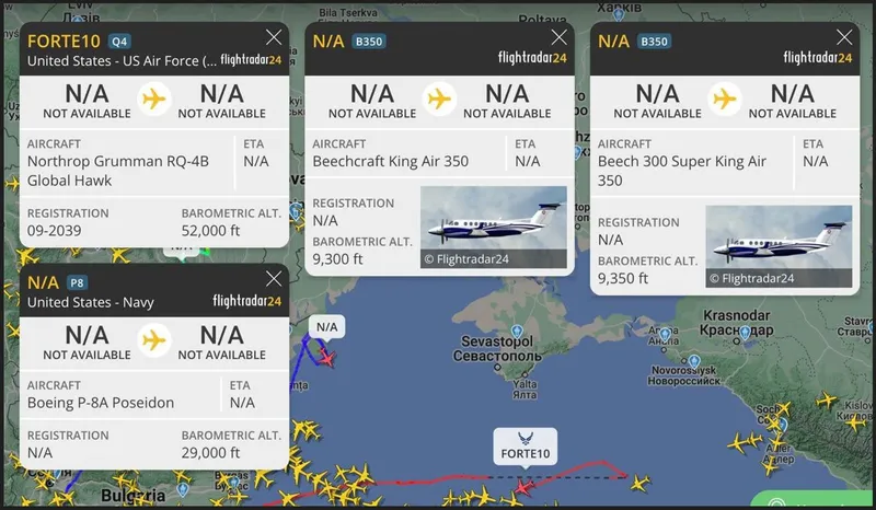 Concentrație de avioane de recunoaștere deasupra României. Rusia pune la adăpost Flota Mării Negre de teama unui atac. În Marea Neagră și regiunea Mării Negre, se observă din nou o concentrație mare de drone și avioane de recunoaștere NATO, potrivit Flightradar24.