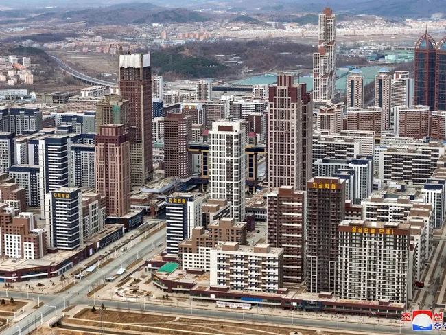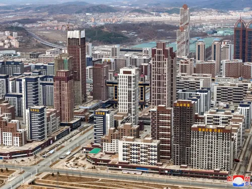 Fotografii ale ansamblului de 10 000 de apartamente, inclusiv cu liderul autoritar al țării Kim Jong Un, care a inspectat șantierul în martie și aprilie, arată zgârie-nori rezidențiali care se revarsă de pe un bulevard larg din noul cartier, Hwasong.
